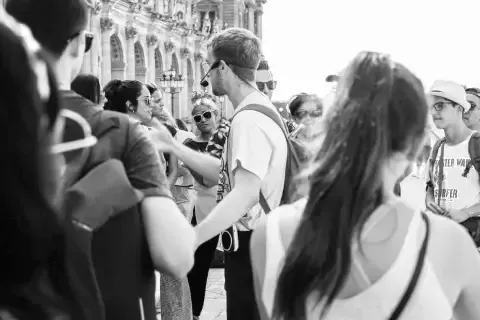 We begin the walking part of the tour from the heart of the city. Alternatively, we can drive through the city center with a golf car (additional costs apply).